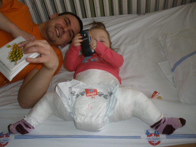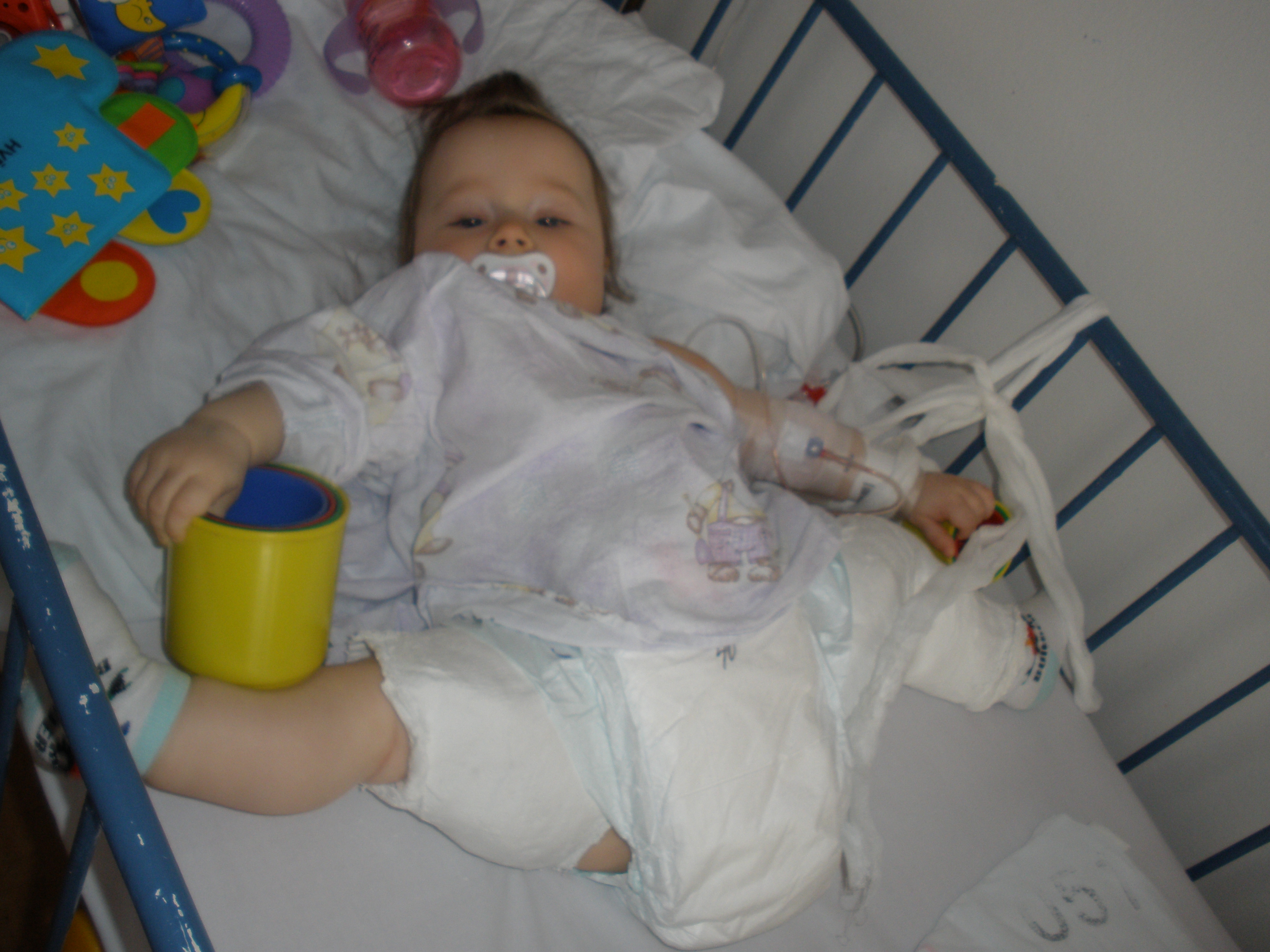 Jelikož v našem případě trakce ani sádry nepomohly, po prvních narozeninkách operovali levý a za 3 týdny poté pravý kyčel. Operace trvala asi 2 a půl hodiny. Poté byla odvezena na JIP, kde ještě dospávala pod utlumujícími léky. Jakmile se vzbudila, sestřičky mne zavolaly a už jsem mohla být s ní, i když moc nevnímala. Navečer už si dala moje mlíčko a druhý den už byla se mnou na pokoji. Po operaci hned na sále dítě zasádrují jako po trakci. Ještě pár dní po operaci dostává preventivně antibiotika, aby se nerozjel nějaký zánět.